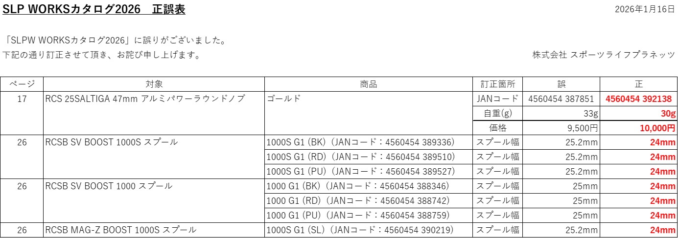 『SLP WORKSカタログ2026』の正誤訂正のご案内